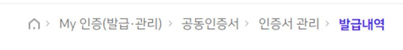 3. MY인증서(발급,관리) > 공동인증서 > 인증서 관리 > 발급내역 클릭
