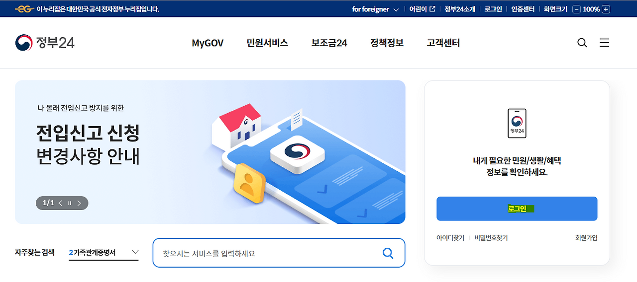 정부24는 정부의 민원 서비스, 정부혜택(보조금24), 정책정보/기관정보 등을 한 곳에서 한 눈에 찾을 수 있고 각 기관의 주요 서비스를 신청·조회·발급할 수 있는 대한민국 정부 대표 포털입니다